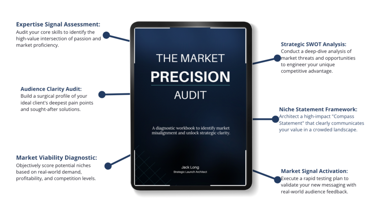 Feeling like you're in a never ending trap in a sea of noise, you're not alone. THE MARKET PRECISION AUDIT provides the surgical framework to identify the unsaturated gap where your expertise is the only logical choice.